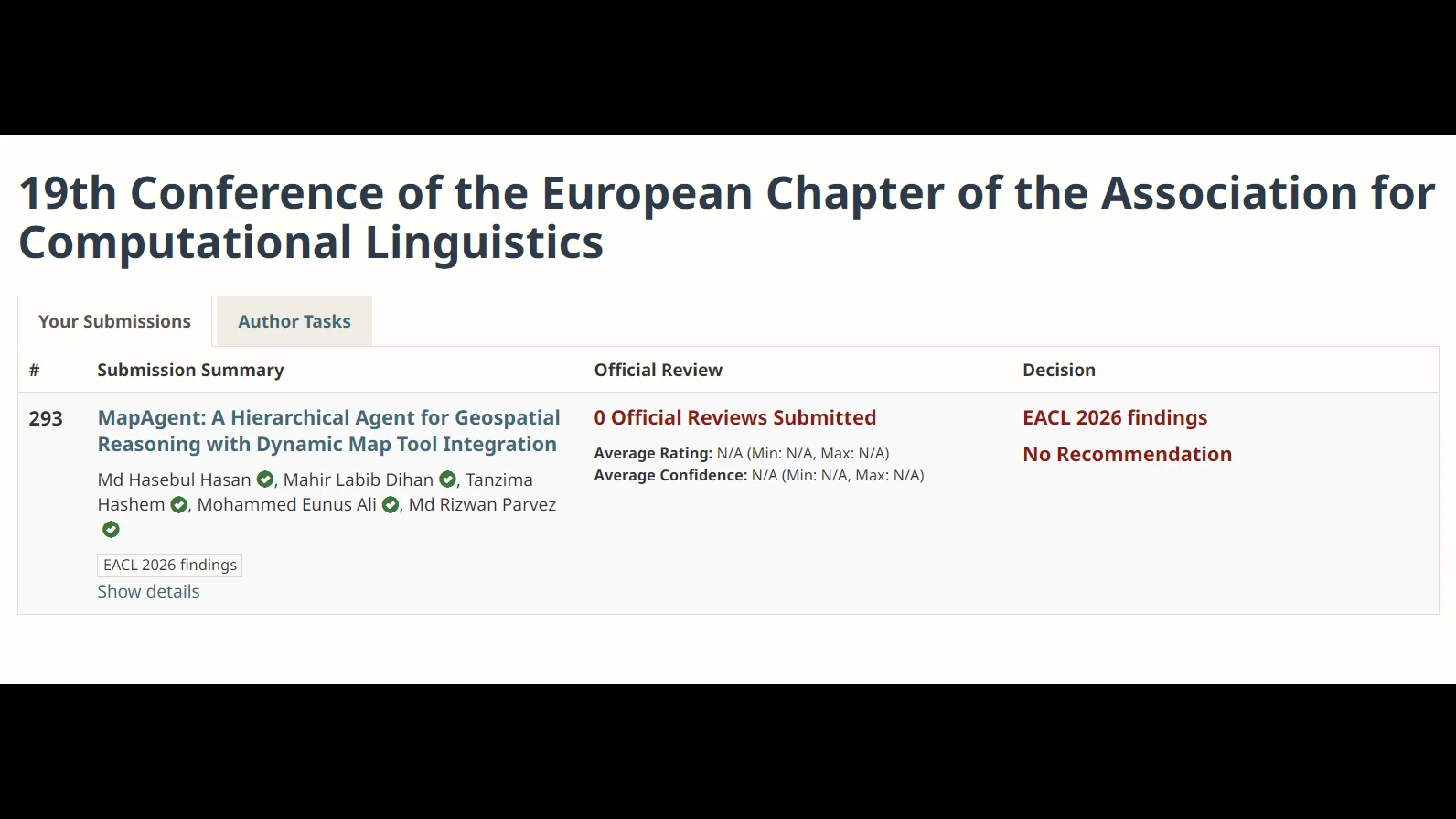 MapEval dataset has reached 1200+ downloads on Hugging Face. MapEval-Visual alone has 850+ downloads.Thanks to all the viewers for reaching 50 subscribers on my youtube channel.Our submission "DFCon: Attention-Driven Supervised Contrastive Learning for Robust Deepfake Detection" was selected among the top 3 finalists in IEEE SPS Signal Processing Cup at ICASSP 2025. We will be presenting our work in ICASSP 2025, Hyderabad, India.MapEval: A Map-Based Evaluation of Geo-Spatial Reasoning in Foundation ModelsMapQaTor: A System for Efficient Annotation of Map Query DatasetsChallenge: Deepfake Face Detection In The Wild